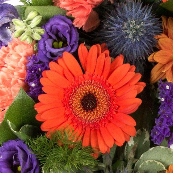 This traditional wreath combines thistles, statice, deep purple lisianthus, carnations and mini gerberas to create a masculine tribute.